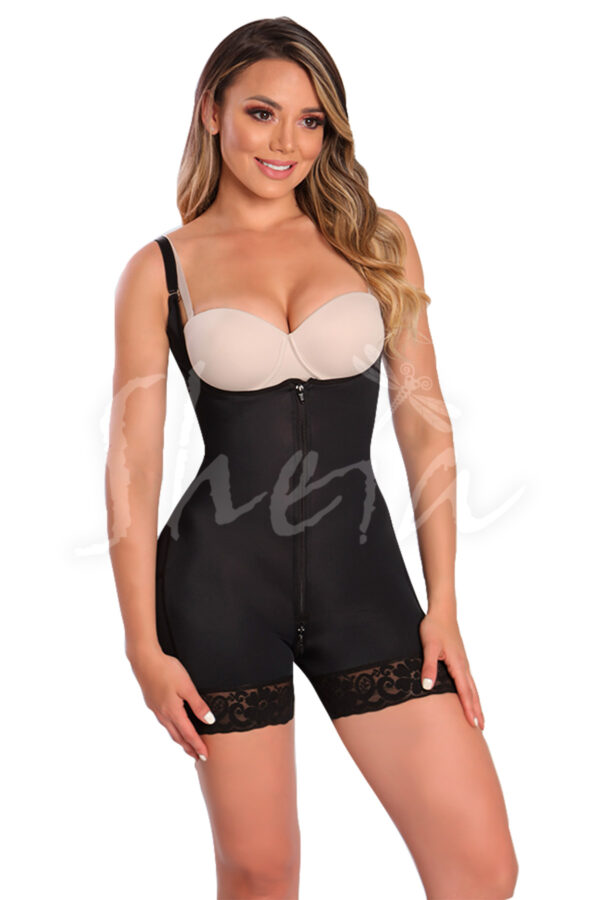 Faja en lycra nylon fría antialérgica en doble capa, con realce de glúteo y control suave en abdomen, cadera, piernas, levanta cola, control alto en espalda, tiras de brasier graduables y removibles. Cremallera invisible en zona perineal con protector, encaje siliconado en piernas para que no se te enrolle.