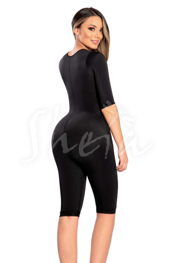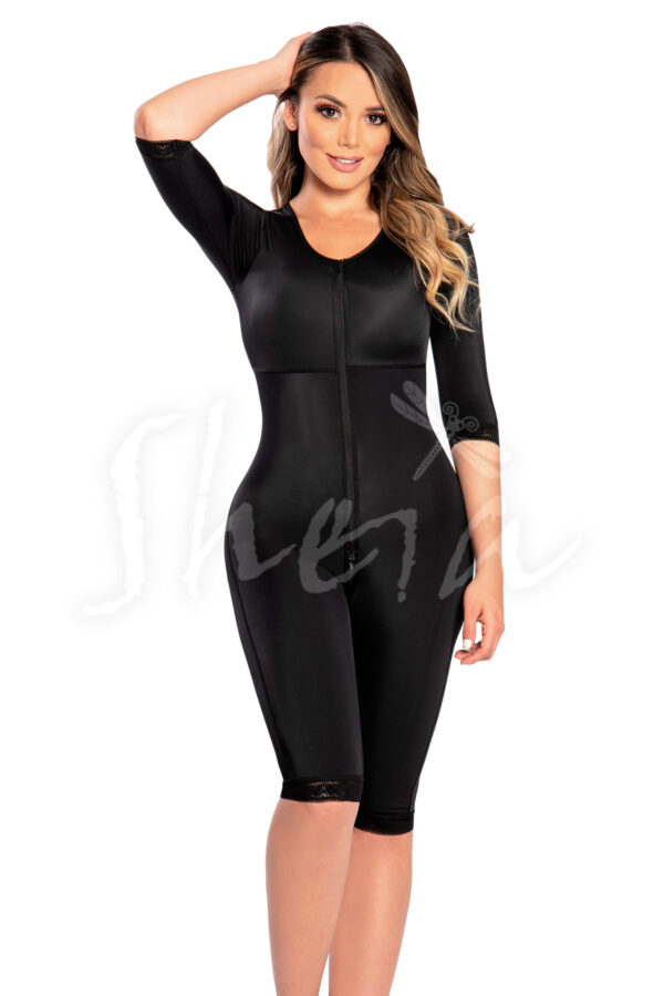 Faja en lycra nylon fría antialérgica en doble capa, con realce de glúteo y control suave en abdomen, cadera, piernas, levanta cola, control alto en espalda, hombros anchos tipo esqueleto con mangas 3/4 y top. Cremallera en la parte frontal con gafetes y protector, cremallera invisible en zona perineal con protector, largo de piernas al tobillo.