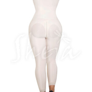 Faja en lycra nylon fría antialérgica en doble capa, con realce de glúteo y control suave en abdomen, cadera, piernas, levanta cola, control alto en espalda, tiras de brasier graduables y removibles. Cremallera invisible en zona perineal con protector, largo de pierna a la rodilla.