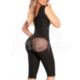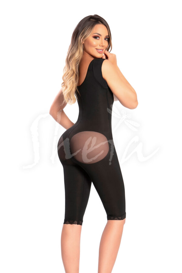 Faja moldeadora con doble compresion en abdomen, cremallera frontal seminvisible gafetes continuos de doble posicion en la parte interna, mangas ultra cortas, realce prehormado exterior efecto levanta cola y pinzas internas con refuerzos en pierna y cadera para un moldeamiento y definición en gluteo, cremallera perineal y protector amplio en zona íntima, controla y guarda los excesos de piel que se marcan con la base del brasier proporcionando una figura más estilizada dando una cobertura alta en la zona de la espalda, hombros anchos tipo esqueleto y mangas cortas chinas para más comodidad. Largo a la rodilla.